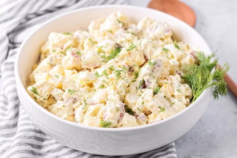 This creamy dill potato salad is made by boiling potatoes until tender, then gently tossing them with a smooth, herby dressing made from mayonnaise, yogurt, mustard, and fresh dill.